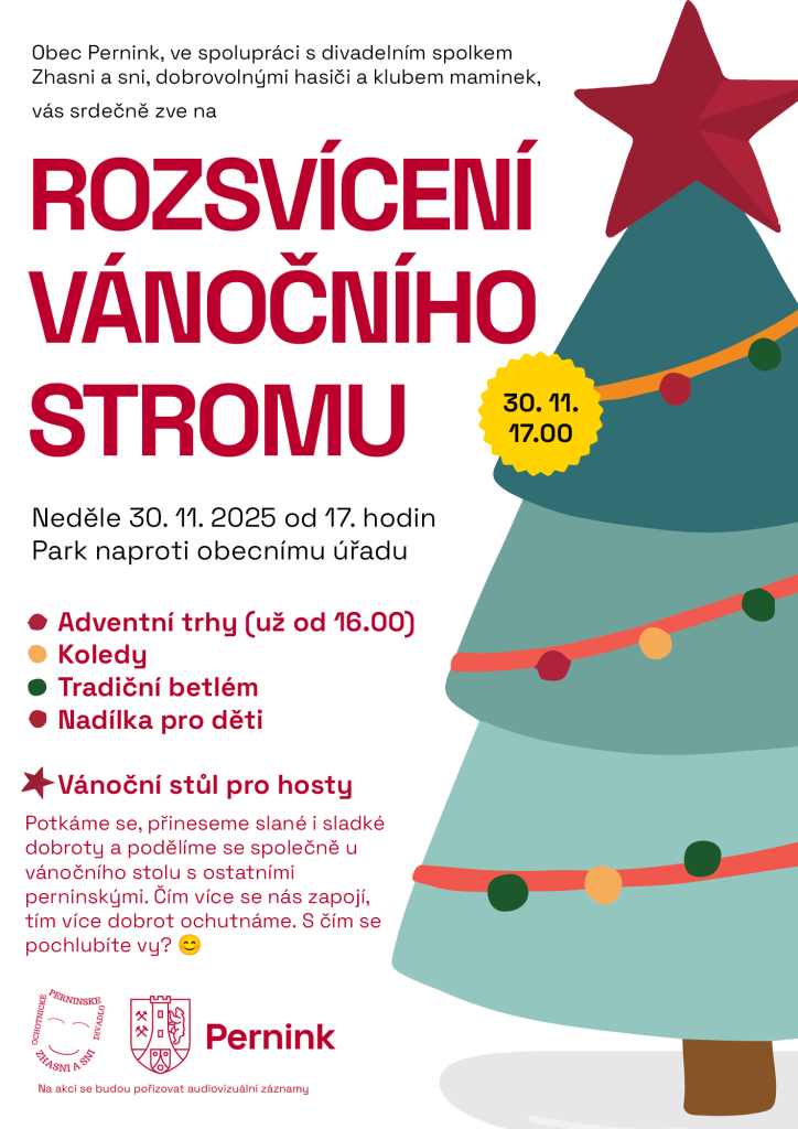 Srdečně vás zveme na rozsvícení vánočního stromečku. Sejít se můžeme dřív, už od 16.00, kdy začnou adventní trhy, budou se zpívat koledy a pro děti bude nachystaná malá nadílka.