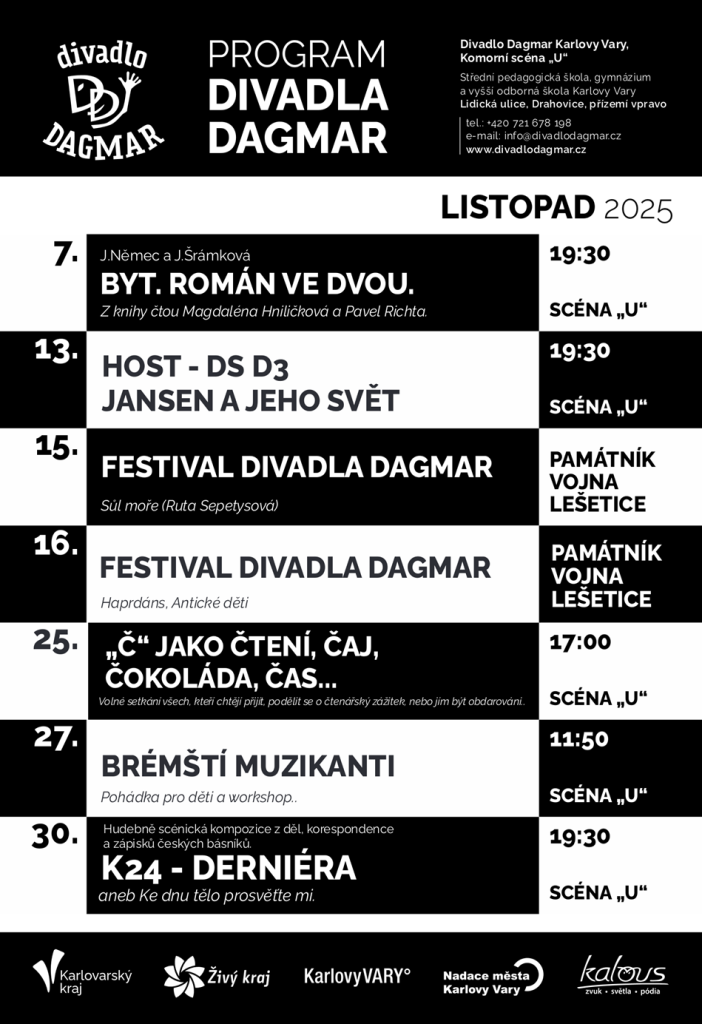 Pod hlavičkou Divadla Dagmar pracuje Studio Divadla Dagmar (složené zejména ze studentů karlovarských středních škol) a Dětské studio dramatické výchovy. Podívejte se, jaký program si připravili na listopad.